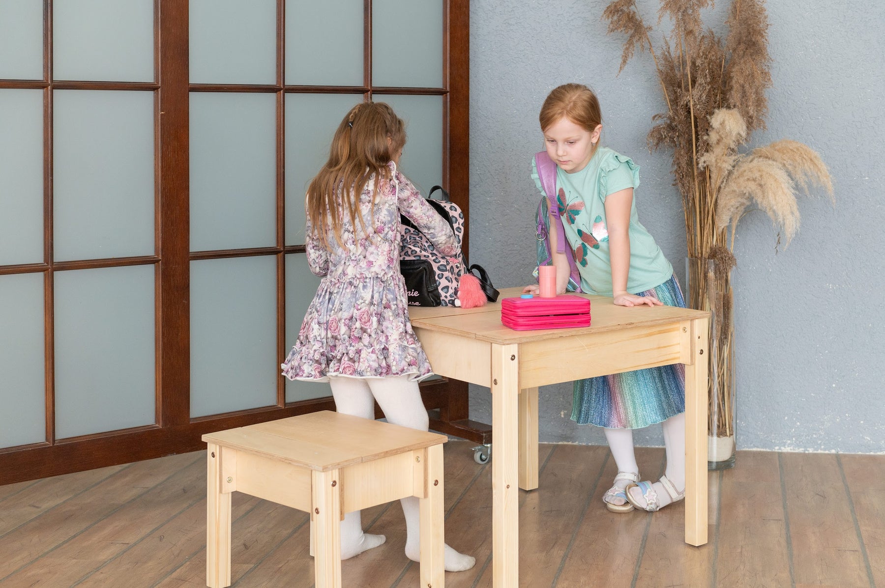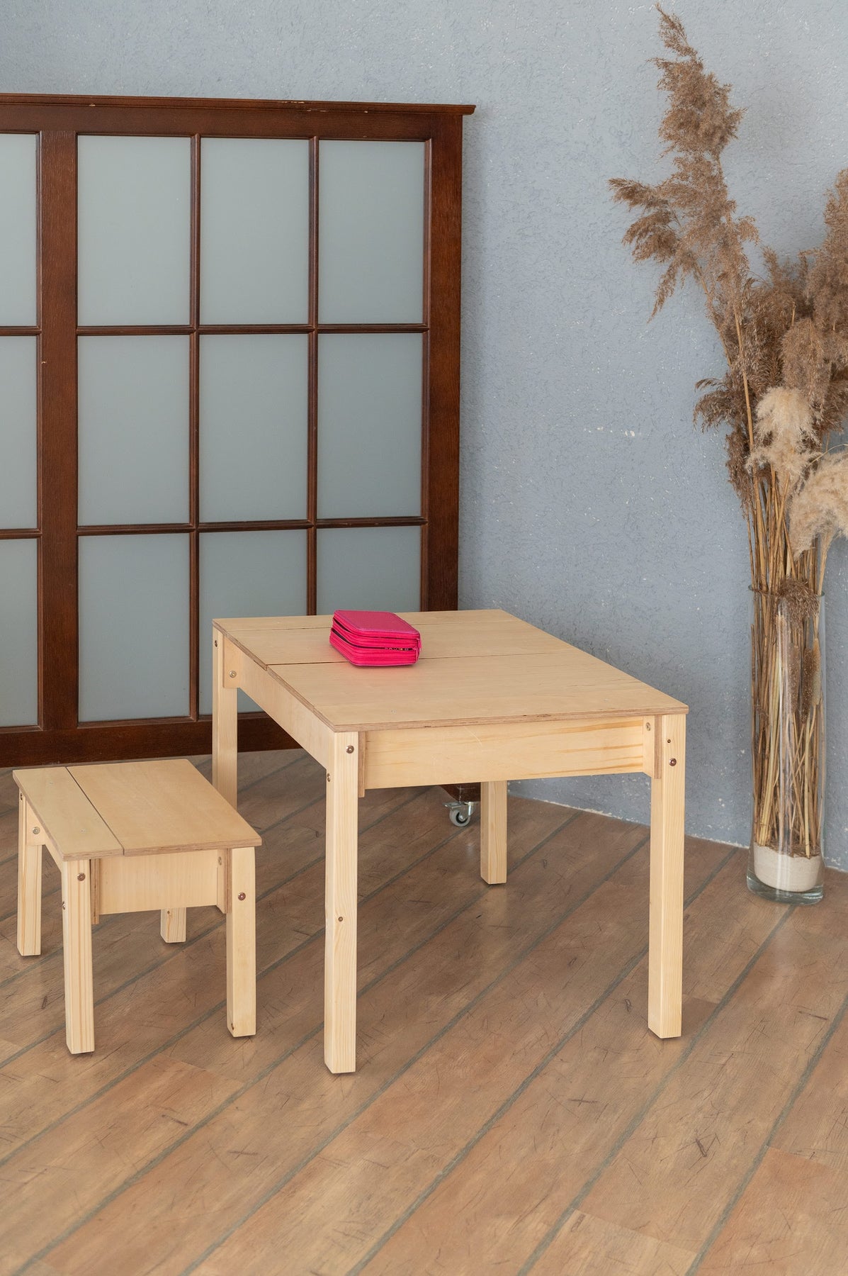 Sæt med smart opbevaringsbord og stol, naturfarvet