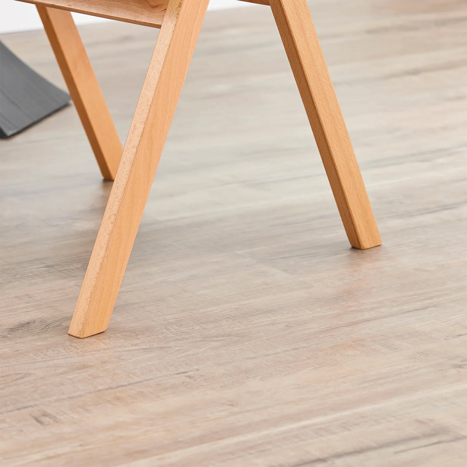 Fremstillet i naturligt bøgetræ for en stabil, holdbar og stilren træstol. Den ergonomiske design giver god støtte til ryggen og holdning – ideel som kontorstol, køkkenstol eller sammenklappelig stol til indendørs brug.