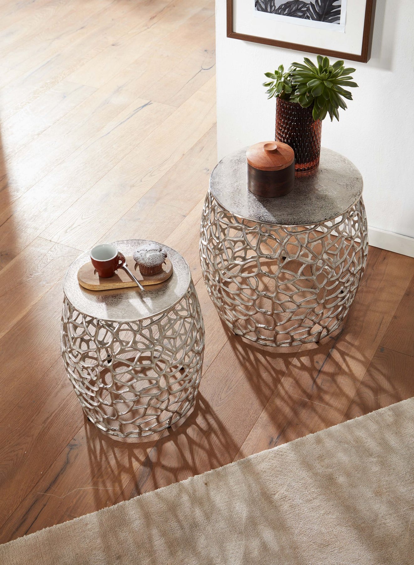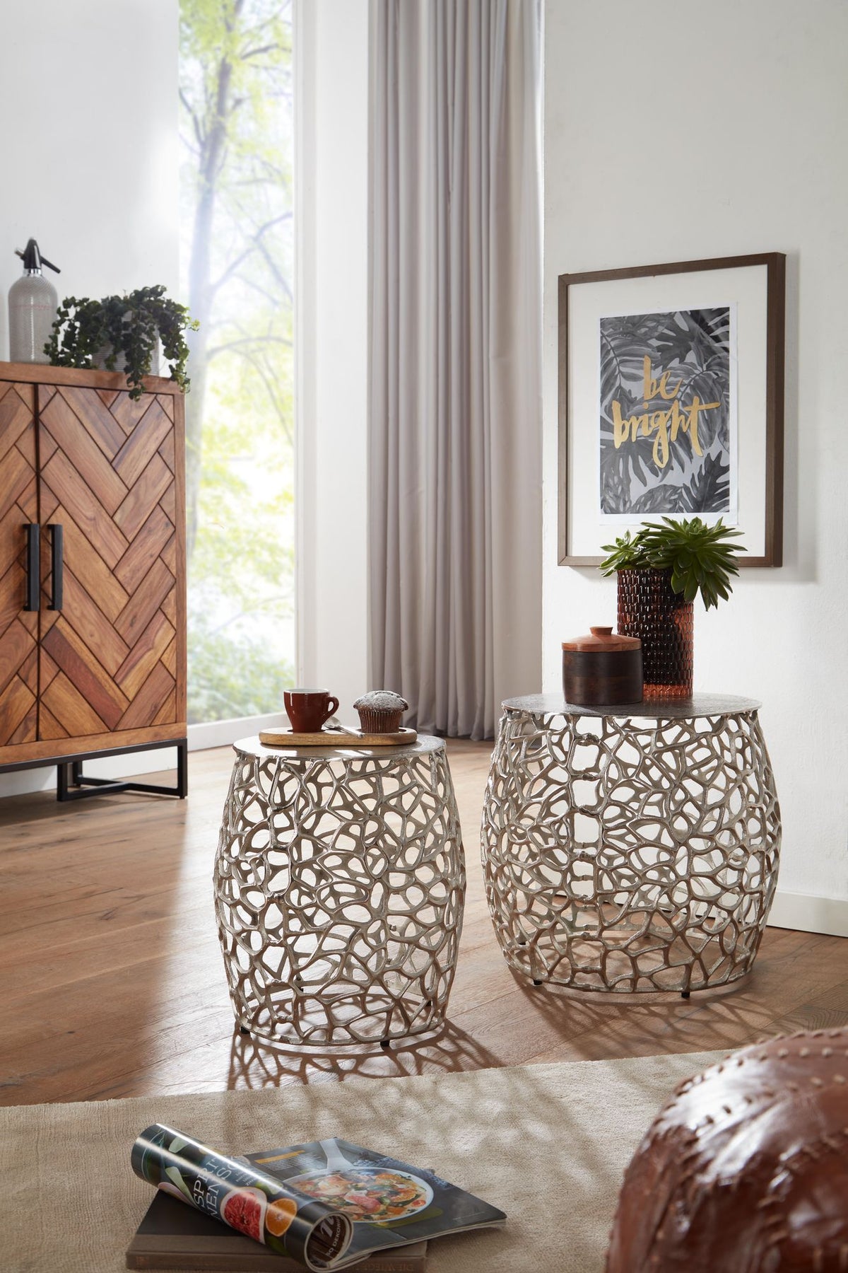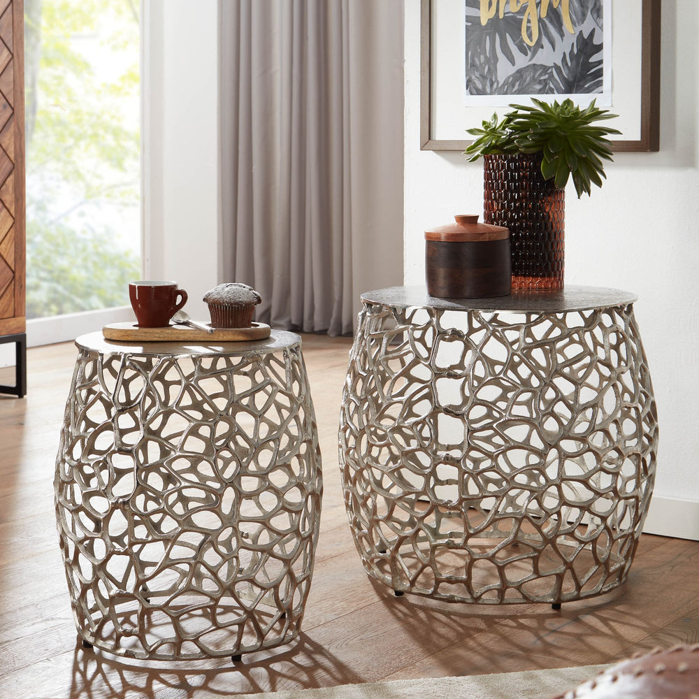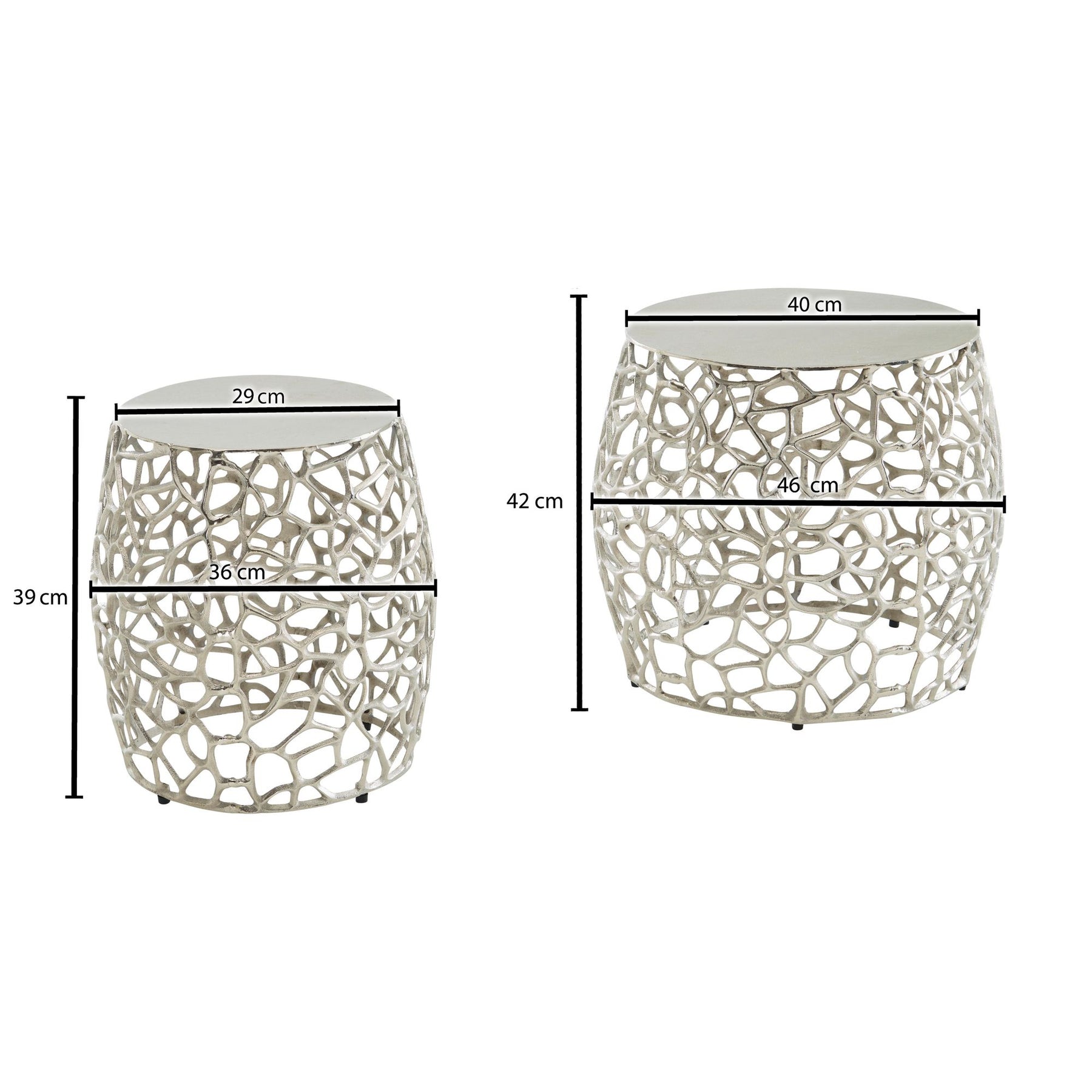 - Bordene kan bruges individuelt eller som et sæt. Velegnet til forskellige rum såsom stuer eller spisestuer. Takket være det moderne design kan sættet nemt kombineres med forskellige indretningsstile. Bordene kan sættes sammen for at spare plads. Hvert bord er kærligt håndlavet og derfor et unikt stykke. Skridsikre puder på stellene beskytter dit gulv mod ridser. Maksimal belastningskapacitet pr. bord: 10 kg. Materiale: Lakeret aluminium. Leveringsomfang: Et sæt med to sideborde (dekoration medfølger ikke). Samling: Leveres som beset. Fuldt samlet og forsvarligt pakket.