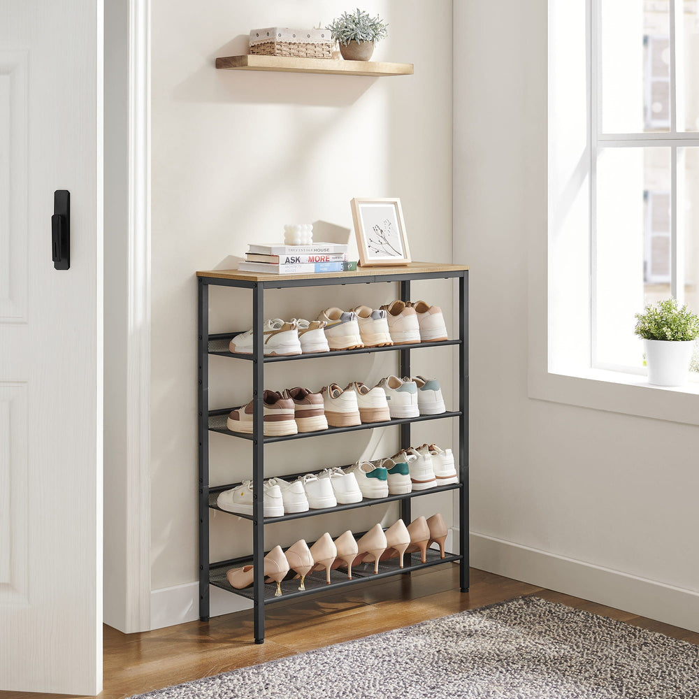Hylden er udstyret med 4 rummelige niveauer, der kan rumme op til 12–16 par sko afhængigt af størrelse. De smarte net-hylder gør den velegnet til både voksen- og børnesko – selv de mindste modeller står stabilt.