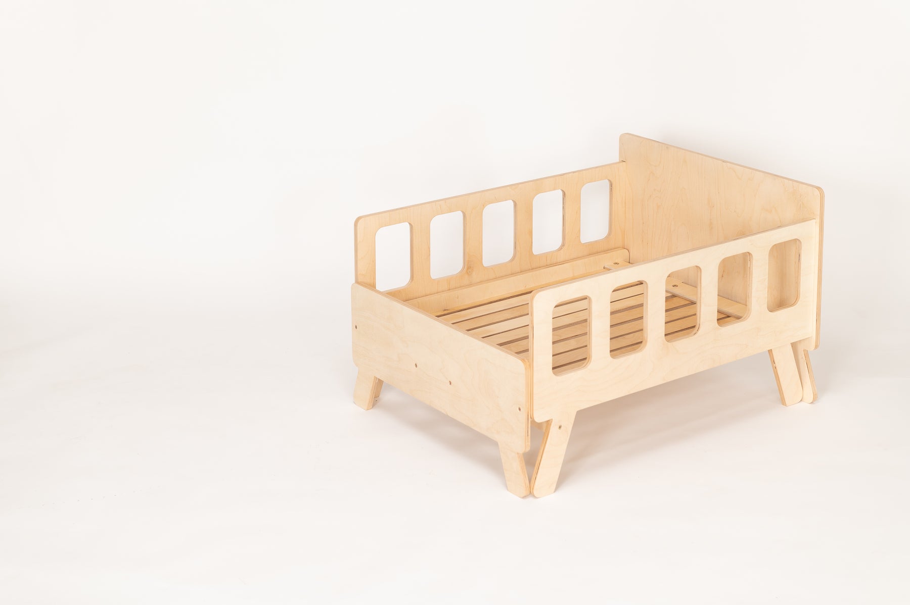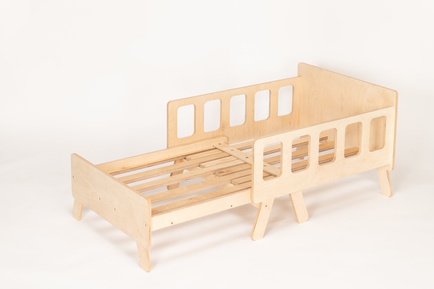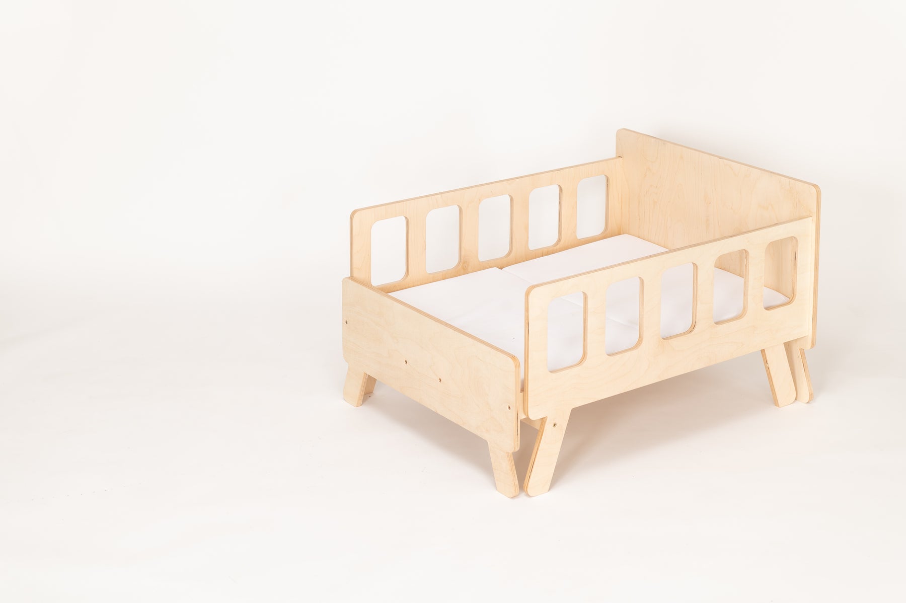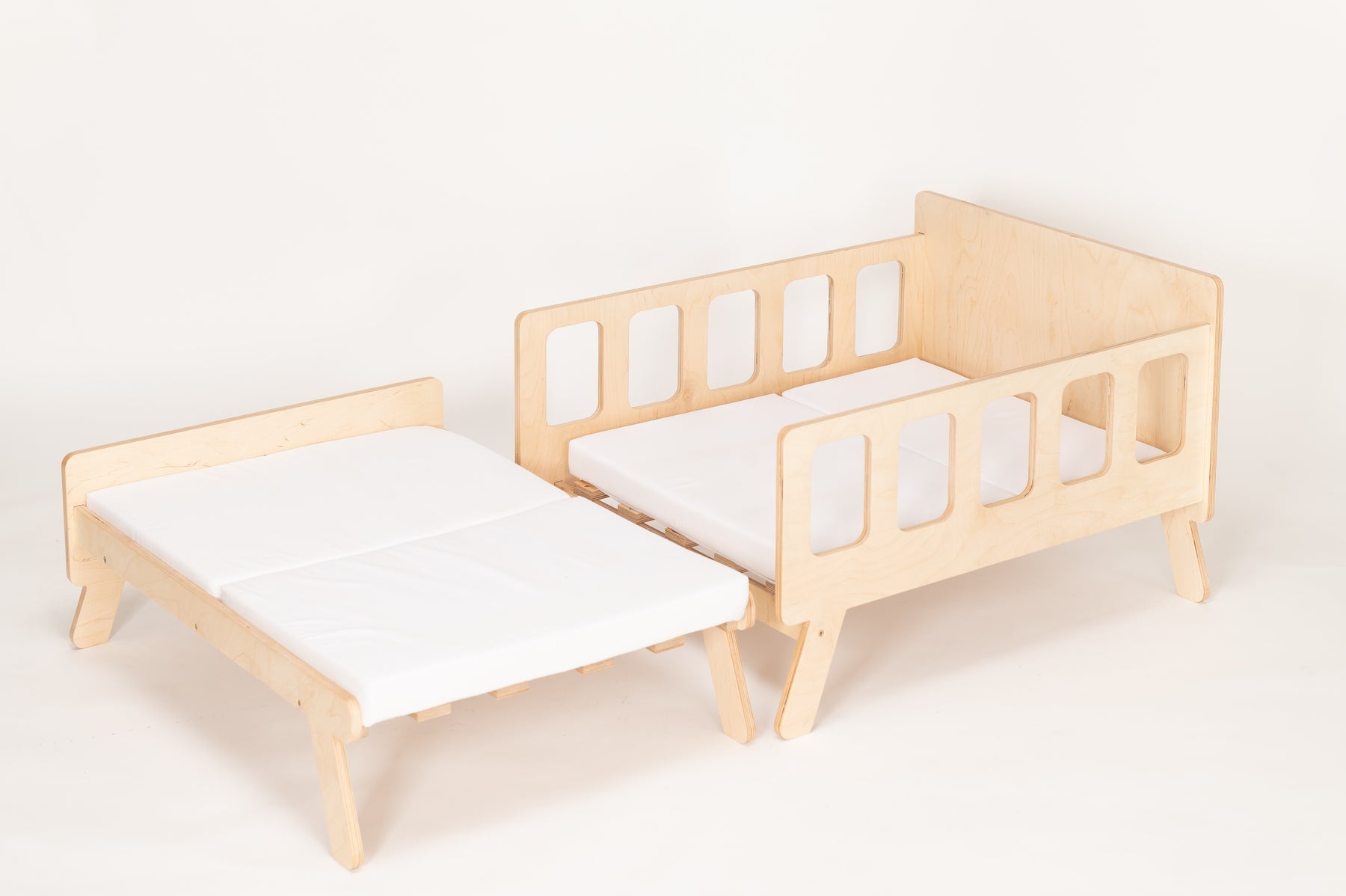 Sengen er smart, fordi den kan bruges til at sove, sidde og lege i. Den vokser med barnet – længden kan forkortes og forlænges, og den kan nemt omdannes til en sofa med ryglæn og armlæn. Og ikke mindst: vi leverer sengen med en madras, som kan tilpasses både sofa og seng, så dit barn føler sig komfortabel hele dagen.