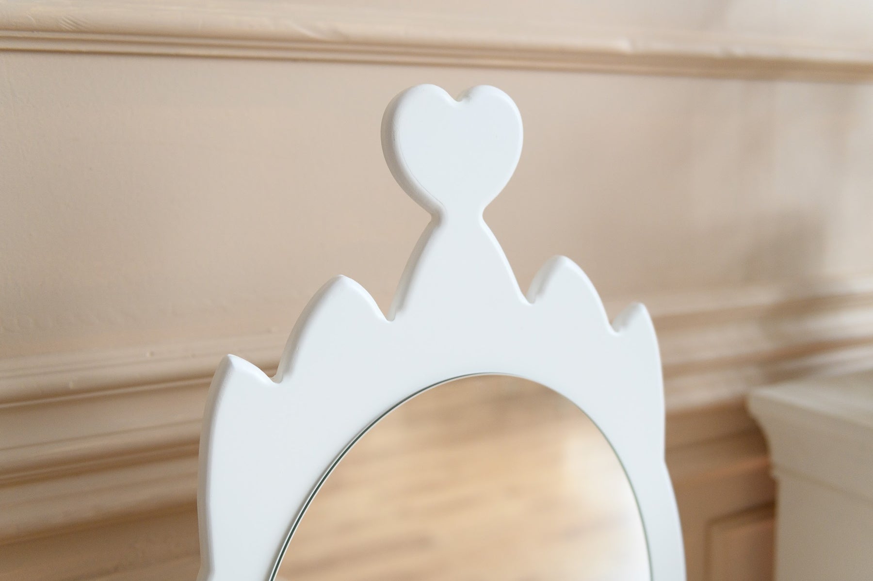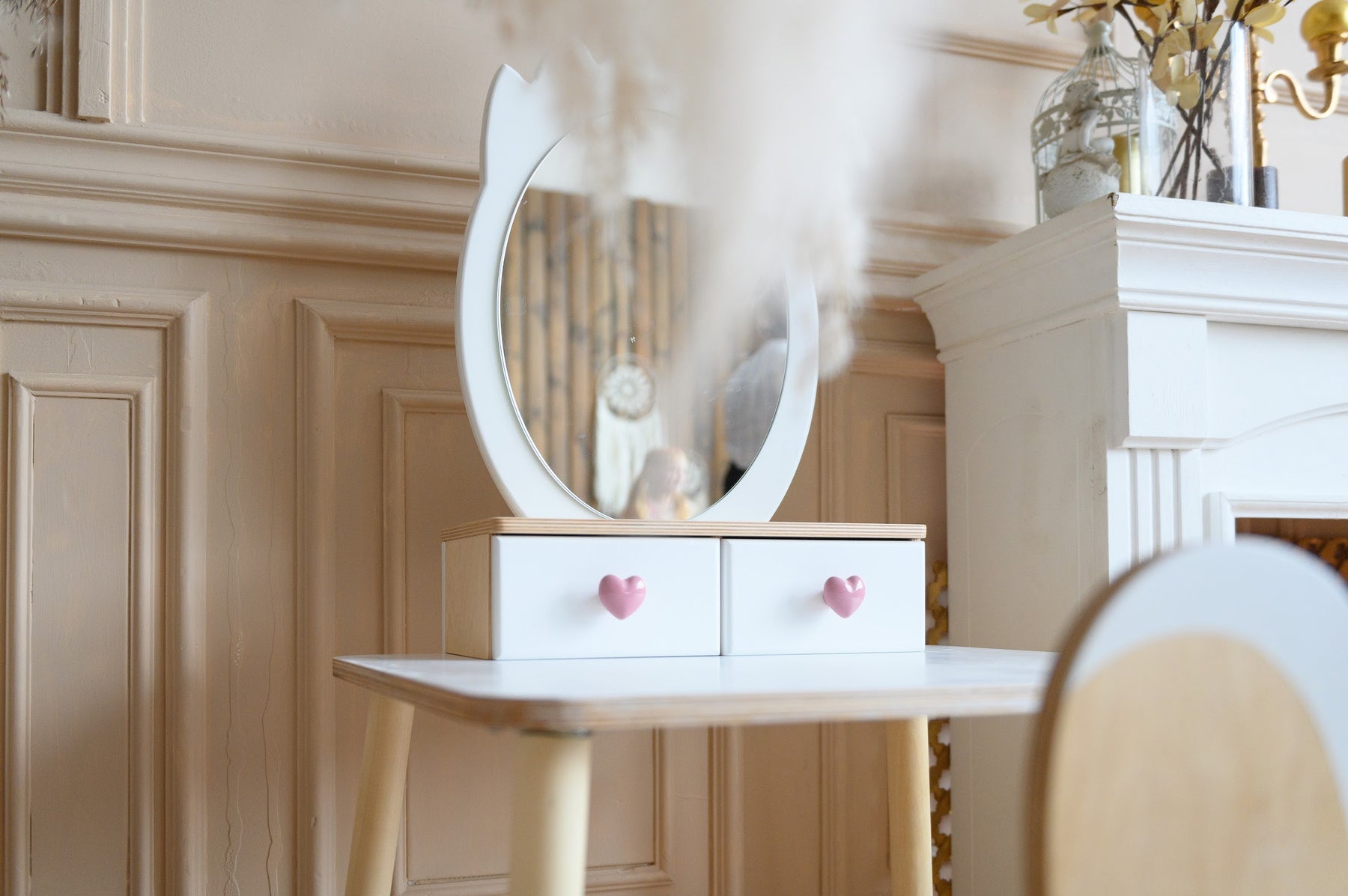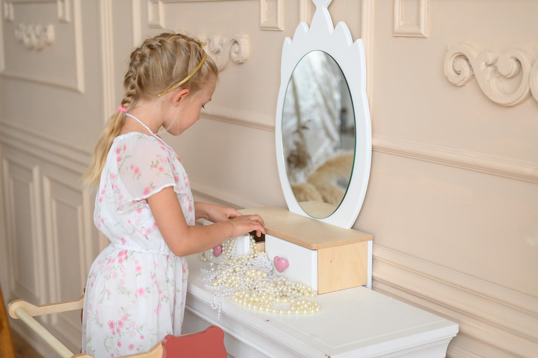 Her mødes klassisk charme og legende elegance. Mere end blot et legetøj er dette sæt en portal til uendelig kreativitet og fantasi. Sættet er smukt designet med et solidt bord og en matchende stol, centreret omkring et stort spejl, der er perfekt til forkælede leg.