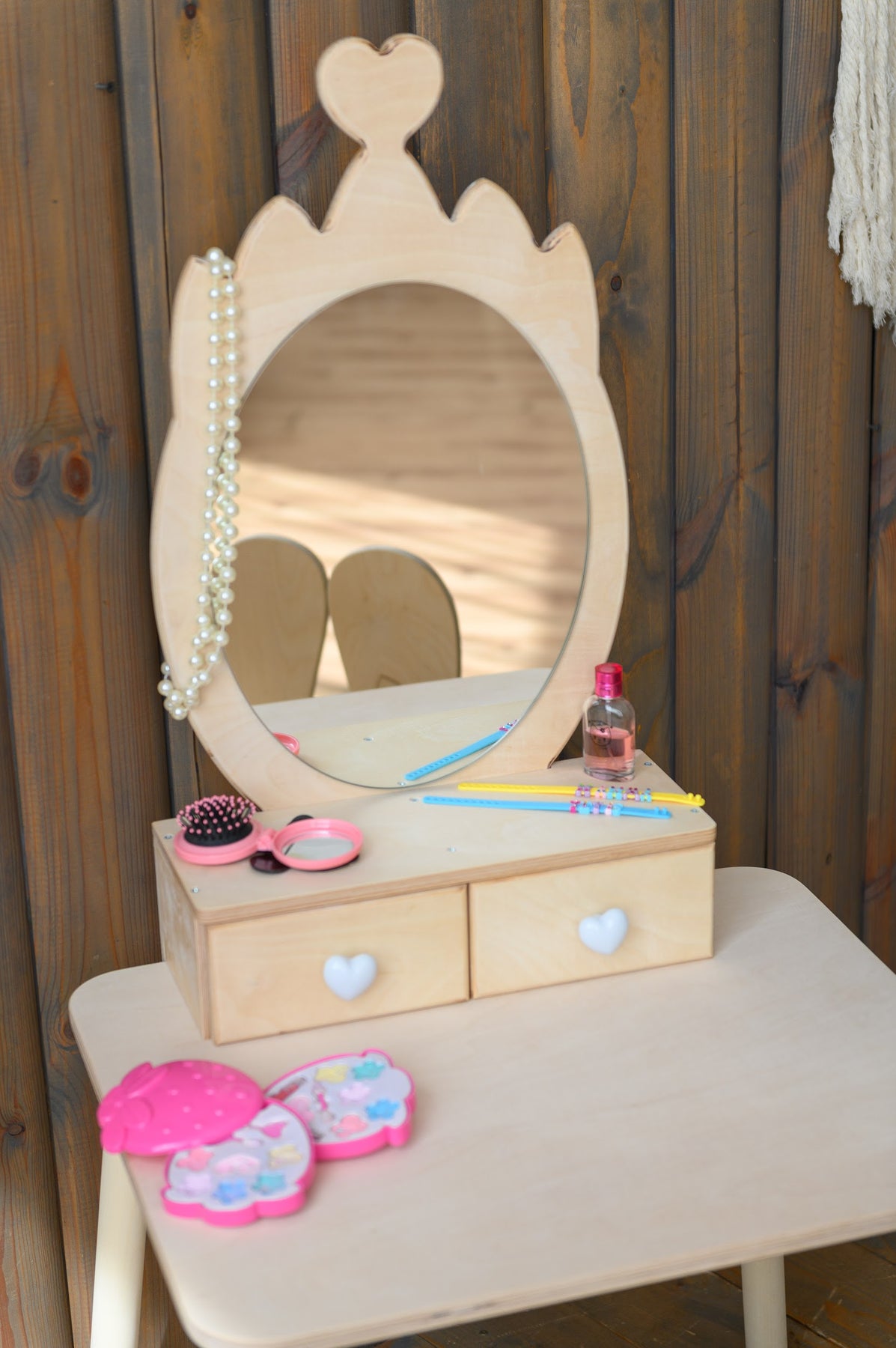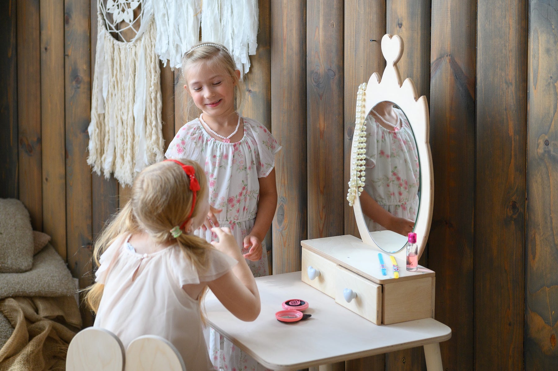 Her mødes klassisk charme og legende elegance. Mere end blot et legetøj er dette sæt en portal til uendelig kreativitet og fantasi. Sættet er smukt designet med et solidt bord og en matchende stol, centreret omkring et stort spejl, der er perfekt til forkælede leg.