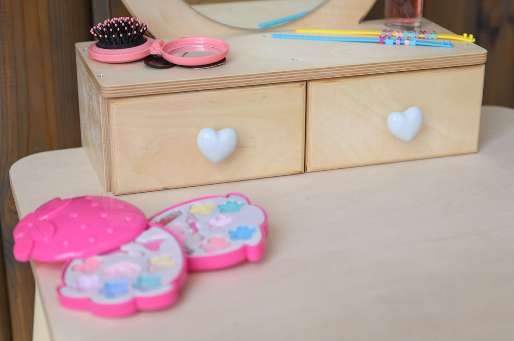 Under spejlet tilbyder praktiske skuffer den perfekte plads til at opbevare alle forkælelsens attributter – fra børster og smykker til legetøjsmakeup. Dette toiletbord er både praktisk og stilet, og gør det til en uundværlig del af den daglige leg. Ideelt til at inspirere til fantasifuld leg, er dette bordssæt den ultimative gave til enhver lille kongelig og tilføjer et strejf af sofistikering til deres personlige legerum.