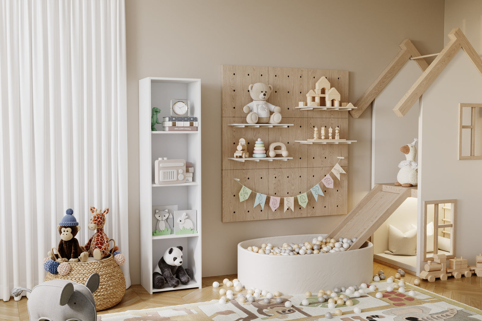 LONI-reolen er en ekstremt alsidig løsning til stuen, børneværelset, soveværelset, gangen, badeværelset eller kontoret. I sin rolle som et praktisk klædeskab med hylder indeni tilbyder den masser af opbevaringsplads til en række forskellige genstande og beskytter dem mod støv og skader. Den robuste konstruktion af lamineret møbelplade af høj kvalitet og MDF-bagpanelet sikrer holdbarhed og modstandsdygtighed over for daglig brug. Den omhyggeligt færdige PVC-kant forstærker møblet yderligere og forhindrer kanterne i at smuldre, mens den grebsløse låge giver reolen et moderne og elegant udseende.