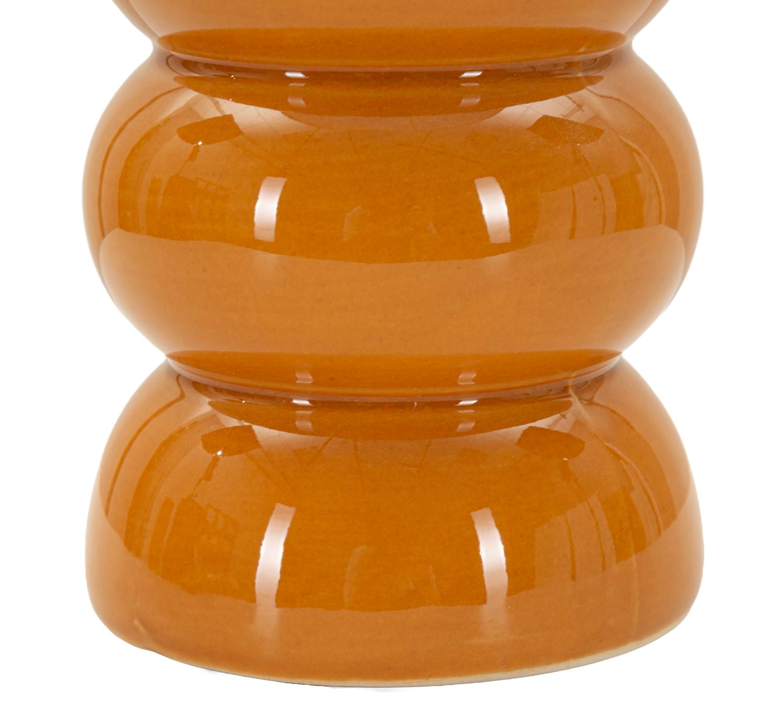 Den blanke finish fremhæver farvens dybde og skaber et elegant samspil med den lyse lampeskærm, som spreder lyset blødt og behageligt i rummet.