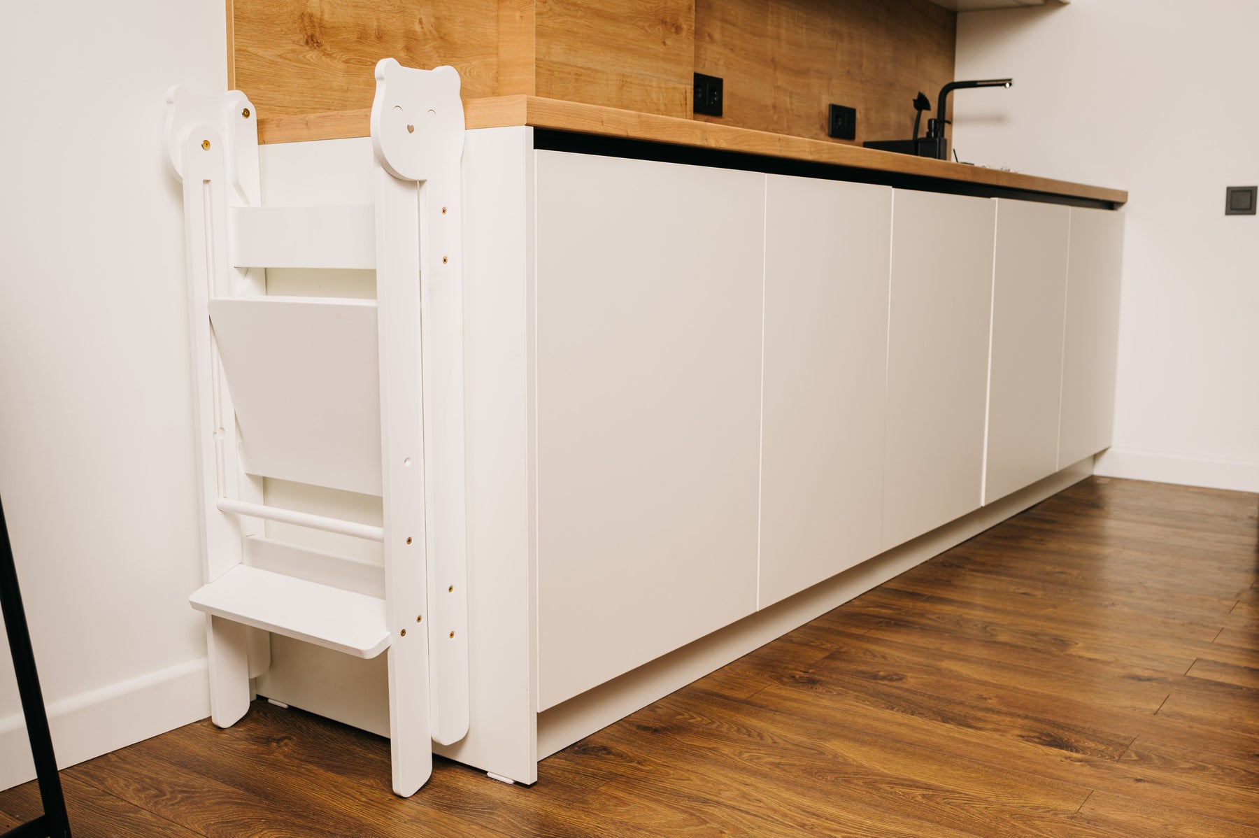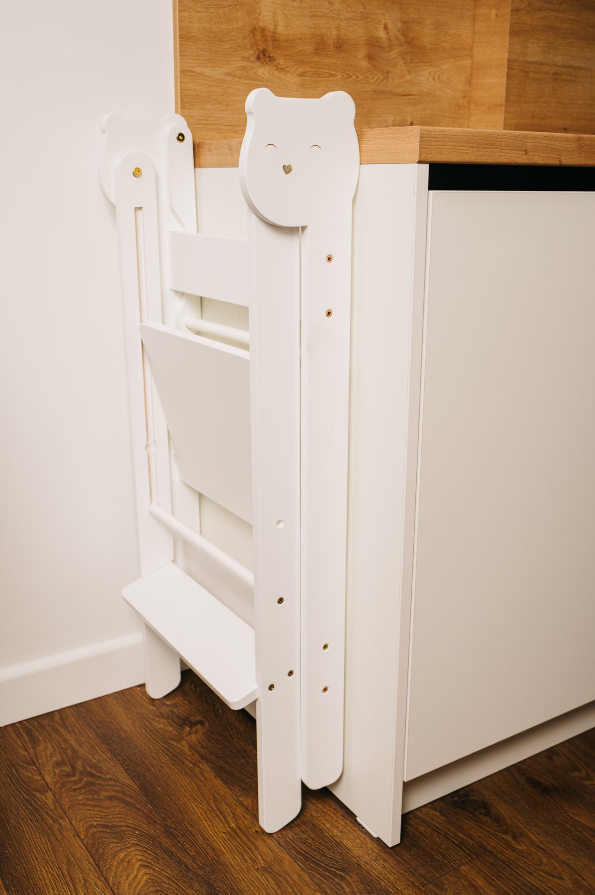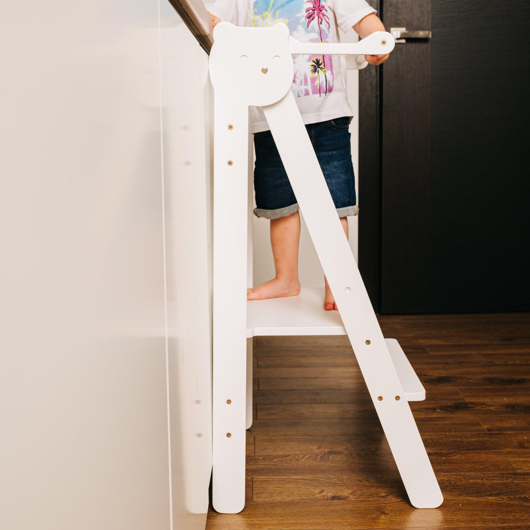 En praktisk, sammenklappelig, sikker og nem at bruge trappestige, designet til børn. Den ser fantastisk ud og er en perfekt hjælper for dit barn, som giver mulighed for at: