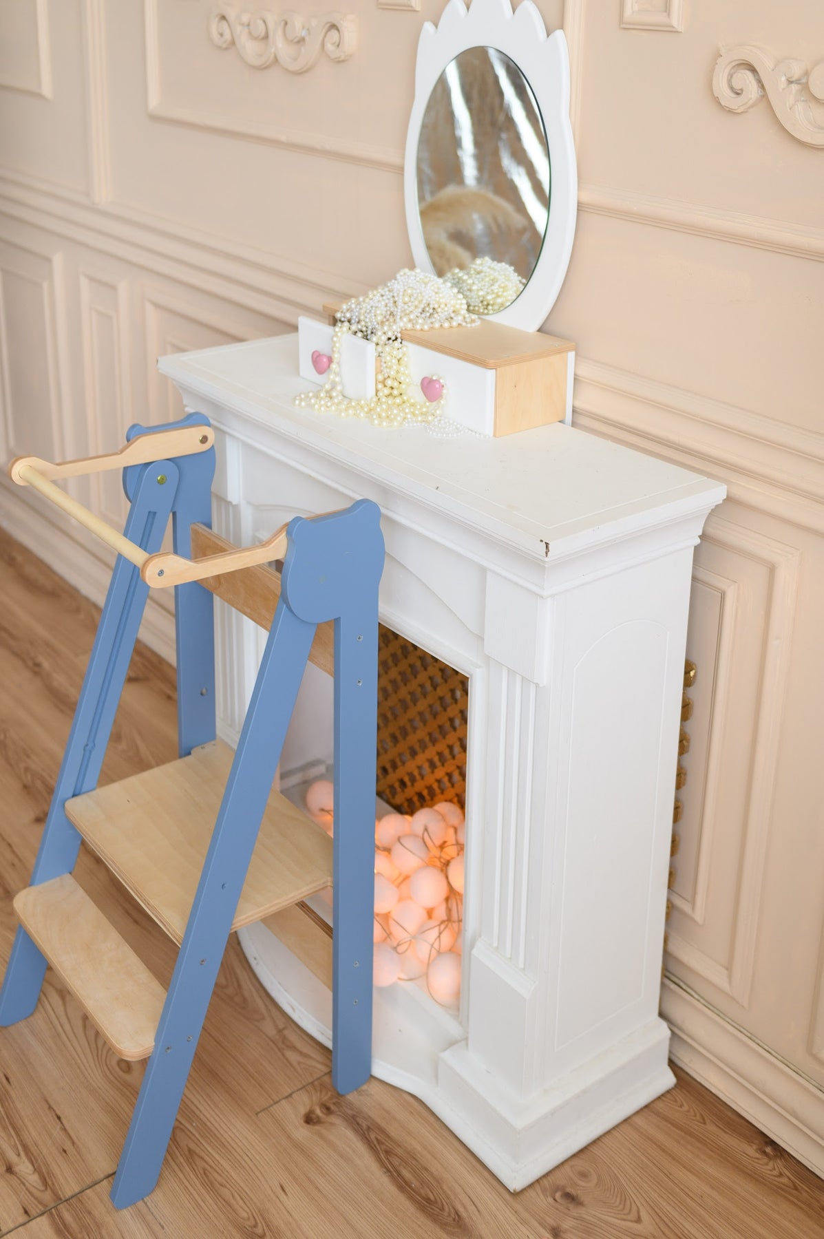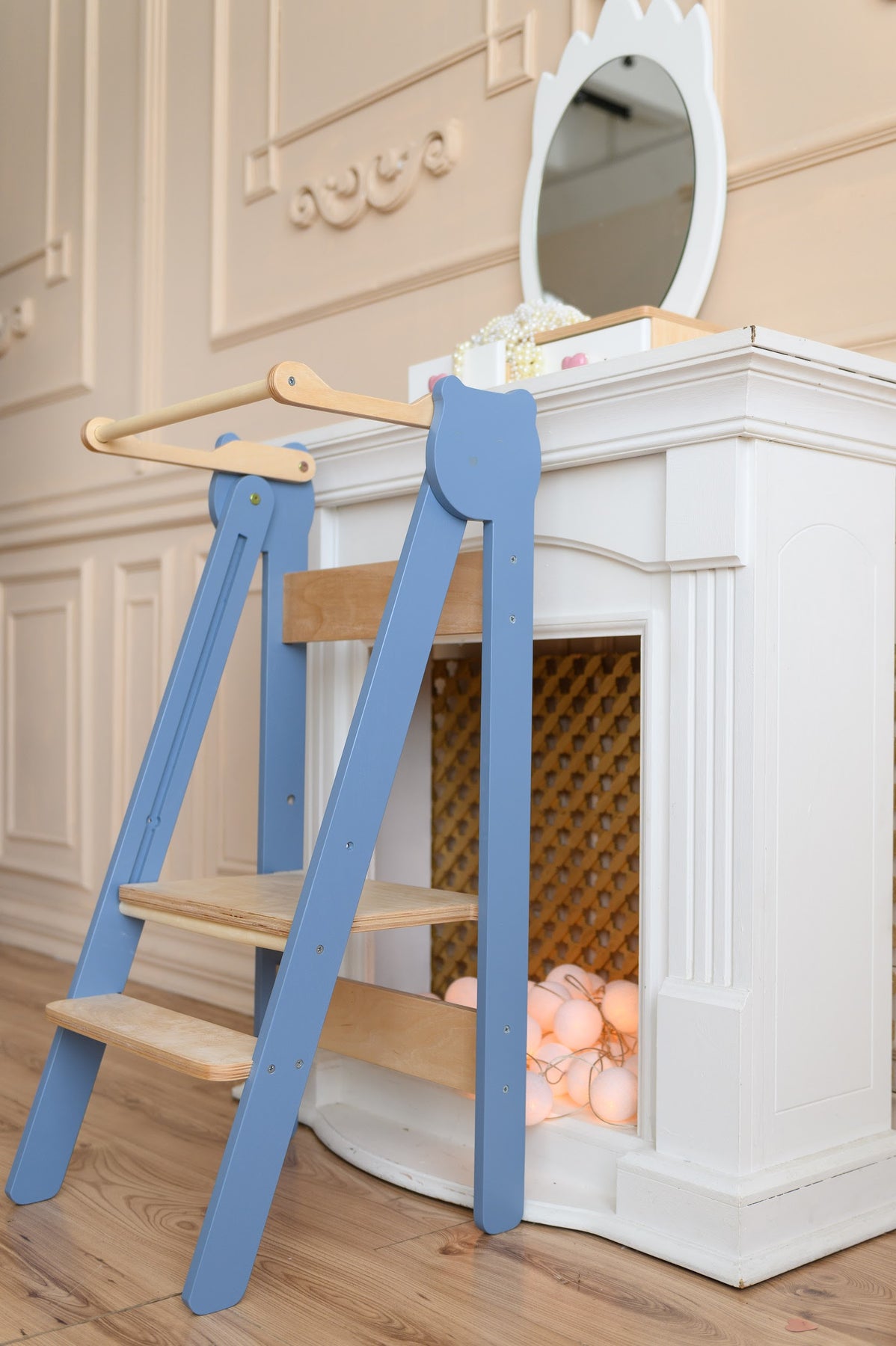 En praktisk, sammenklappelig, sikker og nem at bruge trappestige, designet til børn. Den ser fantastisk ud og er en perfekt hjælper for dit barn, som giver mulighed for at: