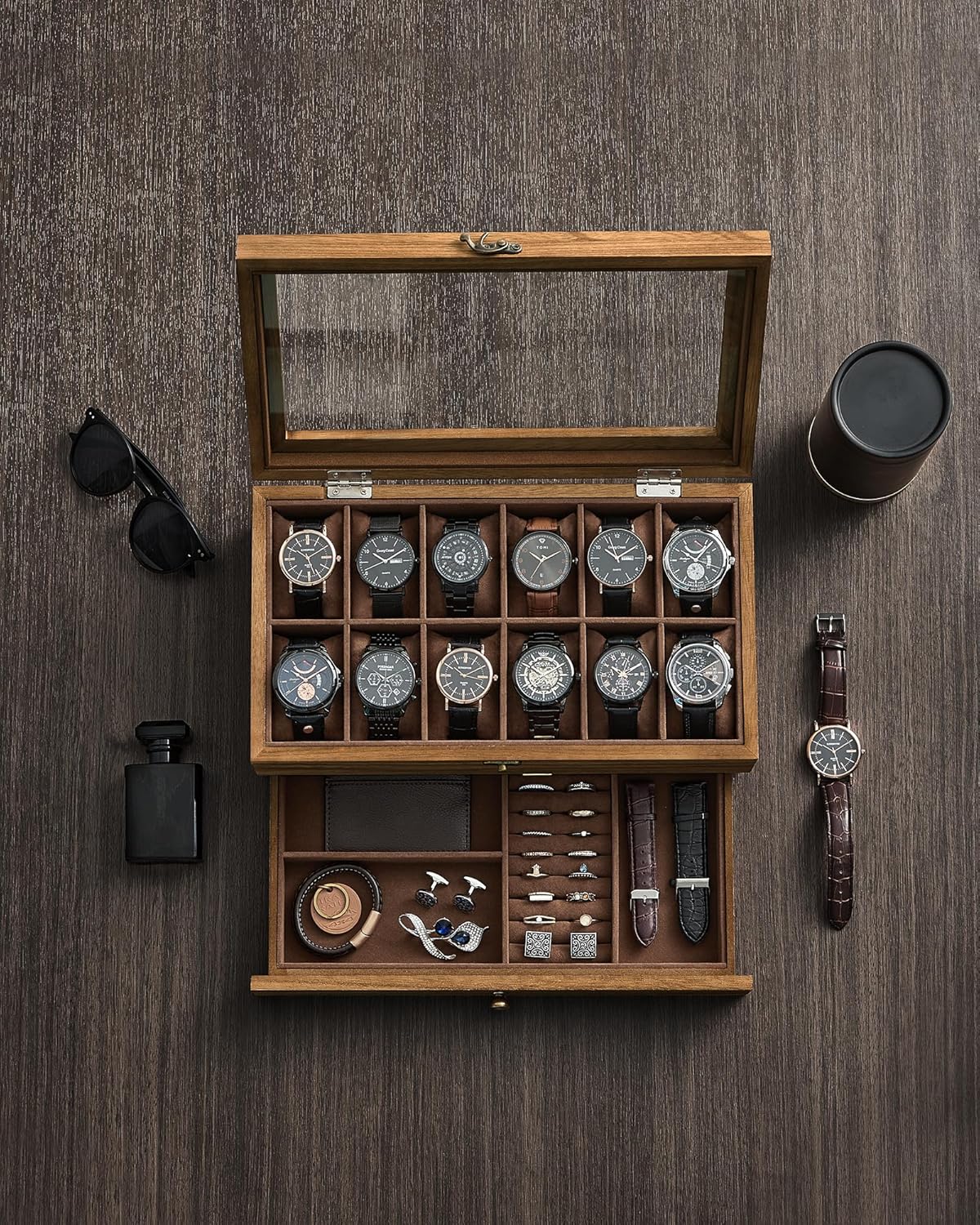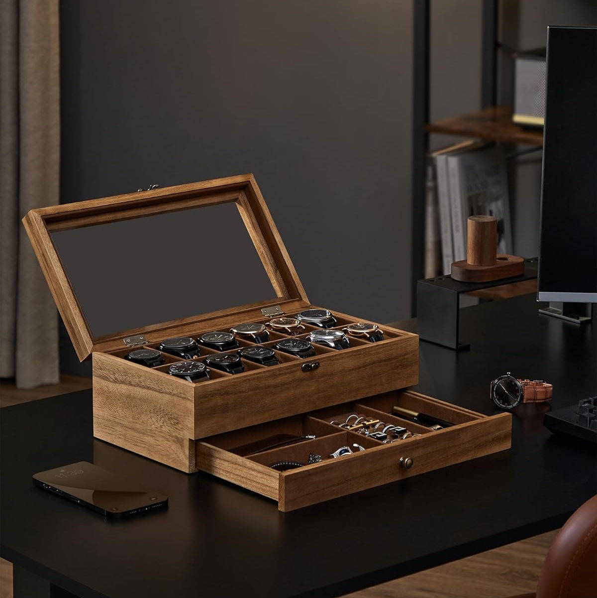 Med plads til 12 ure på den øverste etage og en praktisk skuffe nedenunder med separate rum til dine urremme, ringe og manchetknapper, sikrer denne æske, at alle dine accessories er samlet på ét sted.
