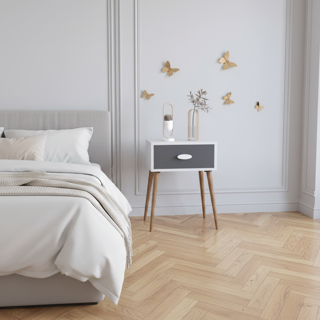 Elsker du 60er-stil? Dette natbord kombinerer moderne retrodesign med skandinavisk elegance. Den letløbende skuffe giver dig praktisk opbevaring, mens det unikke håndtag gør møblet til et ægte blikfang.