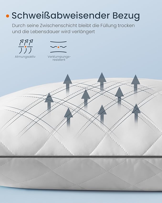 Puden er fyldt med 1200 g polyesterfibre af høj kvalitet, der omfavner dig med en utrolig blødhed. Den er desuden lugtfri og elastisk, hvilket sikrer en rolig og dyb søvn hver nat. Betrækket er udstyret med et innovativt, svedtransporterende lag, der forhindrer klumper, forlænger pudens levetid og sikrer, at du kan sove uforstyrret hele natten.